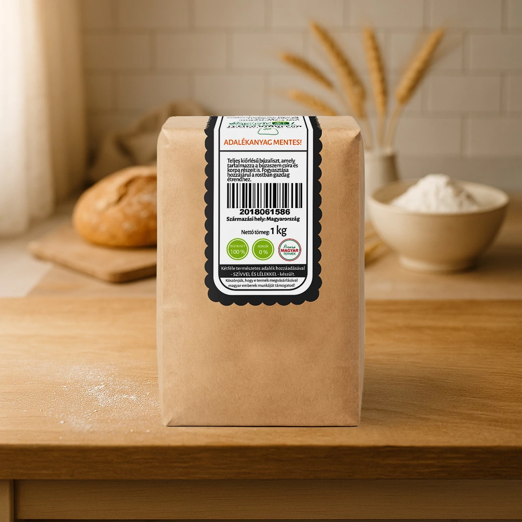 Teljes kiőrlésű búzaliszt, mely tartalmazza a búzaszem csíra és korpa részeit is. Fogyasztása hozzájárul a rostban gazdag étrendhez.
